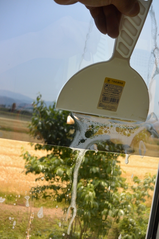 5■石けん水を霧吹きで、たっぷりと、まんべんなくガラスに吹き付けます