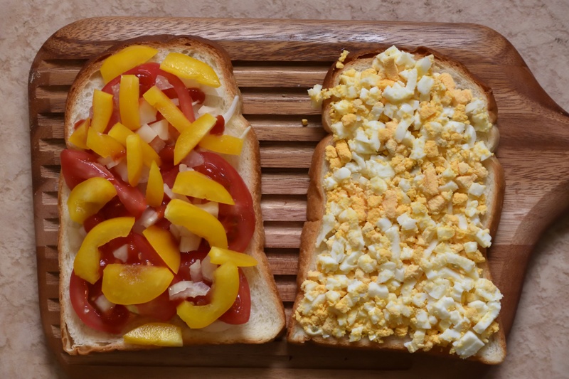 ■右はゆで卵サンド(マヨネーズ味)、左はトマトとパプリカ、セロリにタマネギ、ピクルスとハラペーニョ入り(塩胡椒味)