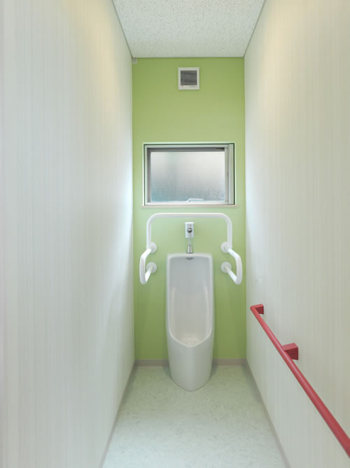 安全性にも特に配慮して、洗い場の感覚は介助の人が入れる広目の間隔と取り、両手で掴まれる、縦型の洗い場手すりと歩行用の床手すりを設けた設計としました。